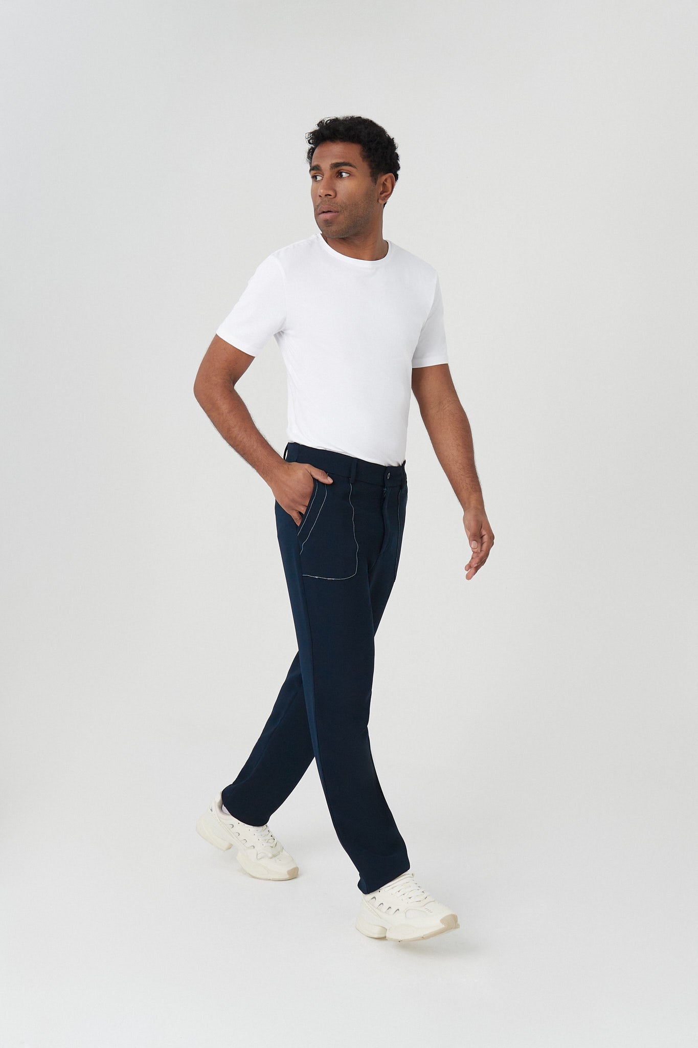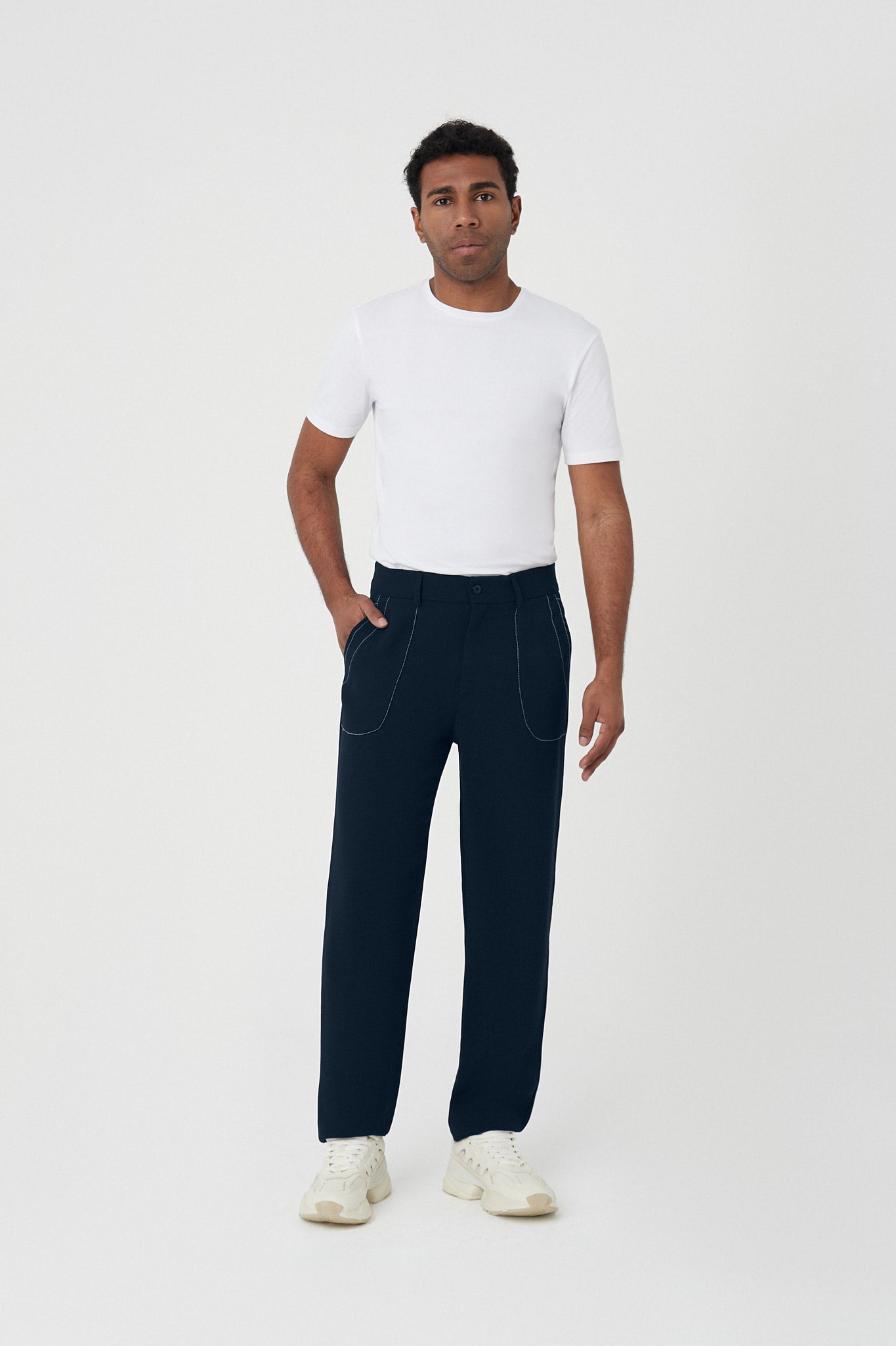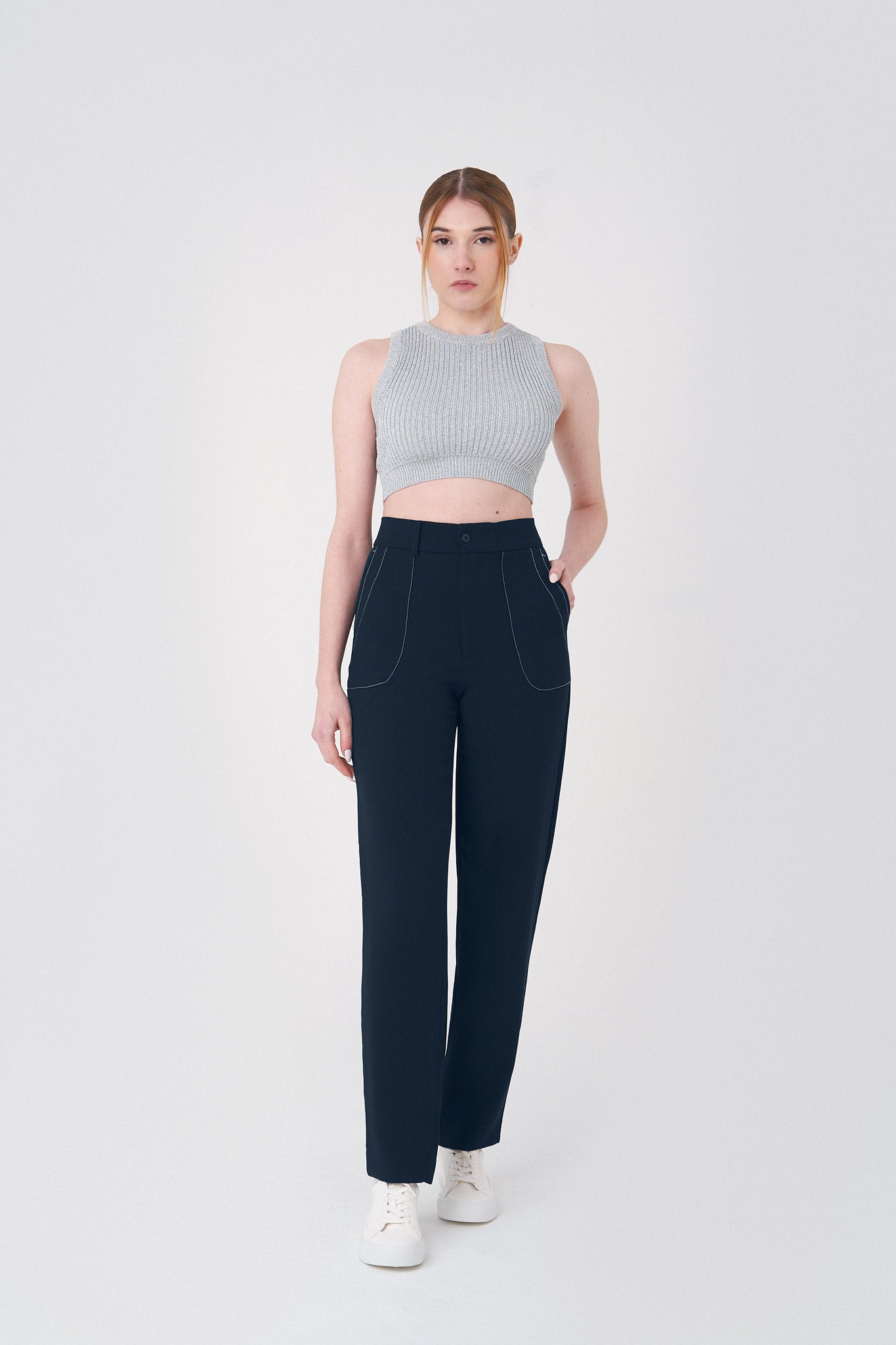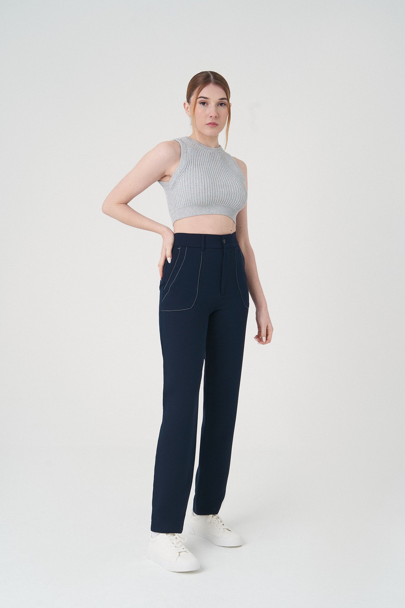 Pantalón azul marino de tiro medio-alto y pernera recta. Maxi bolsillos de plastrón con costura vista. Bolsillo en vivo trasero. Detalle de trabillas en cintura. Cierre frontal con cremallera y botón visible.